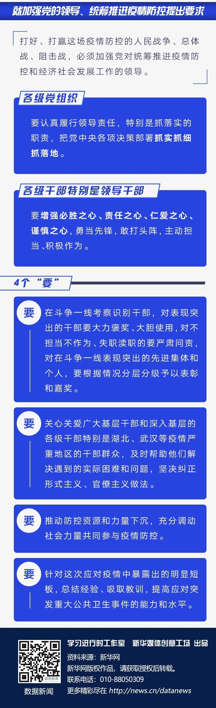 習(xí)近平指出,打好、打贏這場(chǎng)疫情防控的人民戰(zhàn)爭(zhēng)、總體戰(zhàn)、阻擊戰(zhàn),必須加強(qiáng)黨對(duì)統(tǒng)籌推進(jìn)疫情防控和經(jīng)濟(jì)社會(huì)發(fā)展工作的領(lǐng)導(dǎo)。各級(jí)黨組織要認(rèn)真履行領(lǐng)導(dǎo)責(zé)任,特別是抓落實(shí)的職責(zé),把黨中央各項(xiàng)決策部署抓實(shí)抓細(xì)抓落地。各級(jí)干部特別是領(lǐng)導(dǎo)干部要增強(qiáng)必勝之心、責(zé)任之心、仁愛(ài)之心、謹(jǐn)慎之心,勇當(dāng)先鋒,敢打頭陣,主動(dòng)擔(dān)當(dāng)、積極作為。要在斗爭(zhēng)一線考察識(shí)別干部,對(duì)表現(xiàn)突出的干部要大力褒獎(jiǎng)、大膽使用,對(duì)不擔(dān)當(dāng)不作為、失職瀆職的要嚴(yán)肅問(wèn)責(zé),對(duì)在斗爭(zhēng)一線表現(xiàn)突出的先進(jìn)集體和個(gè)人,要根據(jù)情況分層分級(jí)予以表彰和嘉獎(jiǎng)。要關(guān)心關(guān)愛(ài)廣大基層干部和深入基層的各級(jí)干部特別是湖北、武漢等疫情嚴(yán)重地區(qū)的干部群眾,及時(shí)幫助他們解決遇到的實(shí)際困難和問(wèn)題,堅(jiān)決糾正形式主義、官僚主義做法。要推動(dòng)防控資源和力量下沉,充分調(diào)動(dòng)社會(huì)力量共同參與疫情防控。要針對(duì)這次應(yīng)對(duì)疫情中暴露出的明顯短板,總結(jié)經(jīng)驗(yàn)、吸取教訓(xùn),提高應(yīng)對(duì)突發(fā)重大公共衛(wèi)生事件的能力和水平。