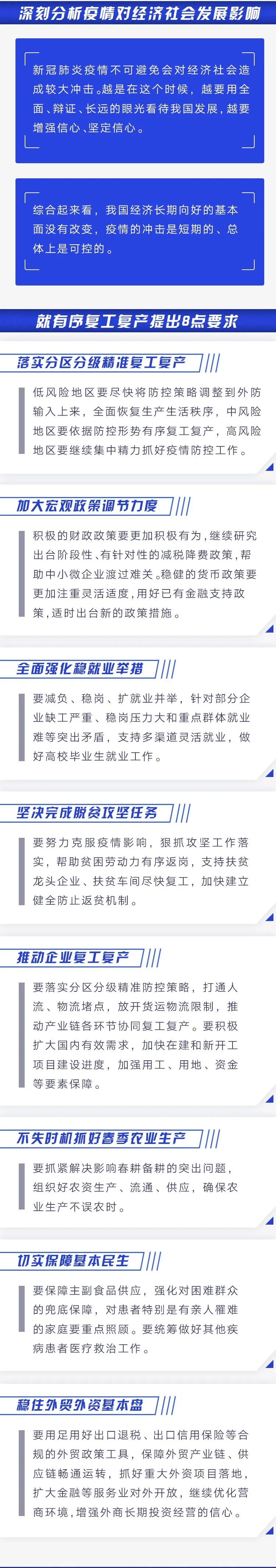 習(xí)近平指出,新冠肺炎疫情不可避免會(huì)對(duì)經(jīng)濟(jì)社會(huì)造成較大沖擊。越是在這個(gè)時(shí)候,越要用全面、辯證、長(zhǎng)遠(yuǎn)的眼光看待我國(guó)發(fā)展,越要增強(qiáng)信心、堅(jiān)定信心。綜合起來(lái)看,我國(guó)經(jīng)濟(jì)長(zhǎng)期向好的基本面沒(méi)有改變,疫情的沖擊是短期的、總體上是可控的。習(xí)近平就有序復(fù)工復(fù)產(chǎn)提出8點(diǎn)要求。第一,落實(shí)分區(qū)分級(jí)精準(zhǔn)復(fù)工復(fù)產(chǎn)。低風(fēng)險(xiǎn)地區(qū)要盡快將防控策略調(diào)整到外防輸入上來(lái),全面恢復(fù)生產(chǎn)生活秩序,中風(fēng)險(xiǎn)地區(qū)要依據(jù)防控形勢(shì)有序復(fù)工復(fù)產(chǎn),高風(fēng)險(xiǎn)地區(qū)要繼續(xù)集中精力抓好疫情防控工作。第二,加大宏觀政策調(diào)節(jié)力度。積極的財(cái)政政策要更加積極有為,繼續(xù)研究出臺(tái)階段性、有針對(duì)性的減稅降費(fèi)政策,幫助中小微企業(yè)渡過(guò)難關(guān)。穩(wěn)健的貨幣政策要更加注重靈活適度,用好已有金融支持政策,適時(shí)出臺(tái)新的政策措施。第三,全面強(qiáng)化穩(wěn)就業(yè)舉措。要減負(fù)、穩(wěn)崗、擴(kuò)就業(yè)并舉,針對(duì)部分企業(yè)缺工嚴(yán)重、穩(wěn)崗壓力大和重點(diǎn)群體就業(yè)難等突出矛盾,支持多渠道靈活就業(yè),做好高校畢業(yè)生就業(yè)工作。第四,堅(jiān)決完成脫貧攻堅(jiān)任務(wù)。要努力克服疫情影響,狠抓攻堅(jiān)工作落實(shí),幫助貧困勞動(dòng)力有序返崗,支持扶貧龍頭企業(yè)、扶貧車間盡快復(fù)工,加快建立健全防止返貧機(jī)制。第五,推動(dòng)企業(yè)復(fù)工復(fù)產(chǎn)。要落實(shí)分區(qū)分級(jí)精準(zhǔn)防控策略,打通人流、物流堵點(diǎn),放開(kāi)貨運(yùn)物流限制,推動(dòng)產(chǎn)業(yè)鏈各環(huán)節(jié)協(xié)同復(fù)工復(fù)產(chǎn)。要積極擴(kuò)大國(guó)內(nèi)有效需求,加快在建和新開(kāi)工項(xiàng)目建設(shè)進(jìn)度,加強(qiáng)用工、用地、資金等要素保障。第六,不失時(shí)機(jī)抓好春季農(nóng)業(yè)生產(chǎn)。要抓緊解決影響春耕備耕的突出問(wèn)題,組織好農(nóng)資生產(chǎn)、流通、供應(yīng),確保農(nóng)業(yè)生產(chǎn)不誤農(nóng)時(shí)。第七,切實(shí)保障基本民生。要保障主副食品供應(yīng),強(qiáng)化對(duì)困難群眾的兜底保障,對(duì)患者特別是有親人罹難的家庭要重點(diǎn)照顧。要統(tǒng)籌做好其他疾病患者醫(yī)療救治工作。第八,穩(wěn)住外貿(mào)外資基本盤。要用足用好出口退稅、出口信用保險(xiǎn)等合規(guī)的外貿(mào)政策工具,保障外貿(mào)產(chǎn)業(yè)鏈、供應(yīng)鏈暢通運(yùn)轉(zhuǎn),抓好重大外資項(xiàng)目落地,擴(kuò)大金融等服務(wù)業(yè)對(duì)外開(kāi)放,繼續(xù)優(yōu)化營(yíng)商環(huán)境,增強(qiáng)外商長(zhǎng)期投資經(jīng)營(yíng)的信心。