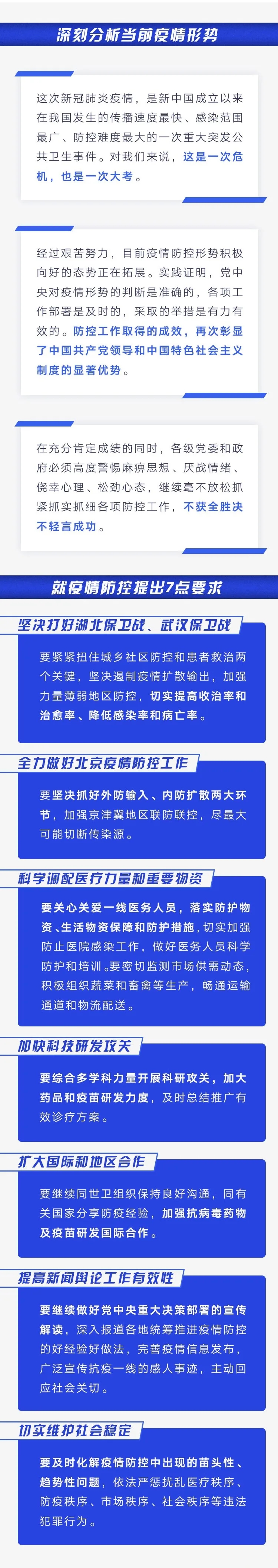 習(xí)近平強(qiáng)調(diào),在充分肯定成績(jī)的同時(shí),各級(jí)黨委和政府必須高度警惕麻痹思想、厭戰(zhàn)情緒、僥幸心理、松勁心態(tài),繼續(xù)毫不放松抓緊抓實(shí)抓細(xì)各項(xiàng)防控工作,不獲全勝?zèng)Q不輕言成功。習(xí)近平提出7點(diǎn)要求。第一,堅(jiān)決打好湖北保衛(wèi)戰(zhàn)、武漢保衛(wèi)戰(zhàn)。要緊緊扭住城鄉(xiāng)社區(qū)防控和患者救治兩個(gè)關(guān)鍵,堅(jiān)決遏制疫情擴(kuò)散輸出,加強(qiáng)力量薄弱地區(qū)防控,切實(shí)提高收治率和治愈率、降低感染率和病亡率。第二,全力做好北京疫情防控工作。要堅(jiān)決抓好外防輸入、內(nèi)防擴(kuò)散兩大環(huán)節(jié),加強(qiáng)京津冀地區(qū)聯(lián)防聯(lián)控,盡最大可能切斷傳染源。第三,科學(xué)調(diào)配醫(yī)療力量和重要物資。要關(guān)心關(guān)愛(ài)一線醫(yī)務(wù)人員,落實(shí)防護(hù)物資、生活物資保障和防護(hù)措施,切實(shí)加強(qiáng)防止醫(yī)院感染工作,做好醫(yī)務(wù)人員科學(xué)防護(hù)和培訓(xùn)。要密切監(jiān)測(cè)市場(chǎng)供需動(dòng)態(tài),積極組織蔬菜和畜禽等生產(chǎn),暢通運(yùn)輸通道和物流配送。第四,加快科技研發(fā)攻關(guān)。要綜合多學(xué)科力量開(kāi)展科研攻關(guān),加大藥品和疫苗研發(fā)力度,及時(shí)總結(jié)推廣有效診療方案。第五,擴(kuò)大國(guó)際和地區(qū)合作。要繼續(xù)同世衛(wèi)組織保持良好溝通,同有關(guān)國(guó)家分享防疫經(jīng)驗(yàn),加強(qiáng)抗病毒藥物及疫苗研發(fā)國(guó)際合作。第六,提高新聞?shì)浾摴ぷ饔行?。要繼續(xù)做好黨中央重大決策部署的宣傳解讀,深入報(bào)道各地統(tǒng)籌推進(jìn)疫情防控的好經(jīng)驗(yàn)好做法,完善疫情信息發(fā)布,廣泛宣傳抗疫一線的感人事跡,主動(dòng)回應(yīng)社會(huì)關(guān)切。第七,切實(shí)維護(hù)社會(huì)穩(wěn)定。要及時(shí)化解疫情防控中出現(xiàn)的苗頭性、趨勢(shì)性問(wèn)題,依法嚴(yán)懲擾亂醫(yī)療秩序、防疫秩序、市場(chǎng)秩序、社會(huì)秩序等違法犯罪行為。