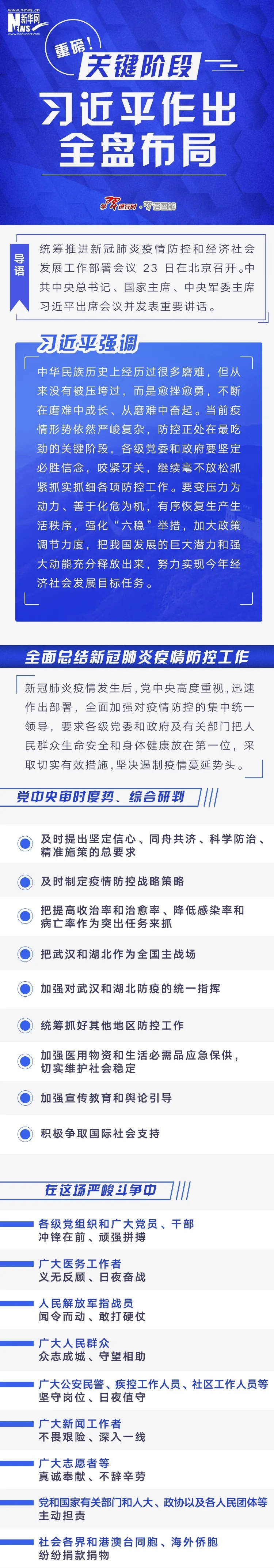 2月23日,統(tǒng)籌推進(jìn)新冠肺炎疫情防控和經(jīng)濟(jì)社會(huì)發(fā)展工作部署會(huì)議在北京召開(kāi)。中共中央總書記、國(guó)家主席、中央軍委主席習(xí)近平出席會(huì)議并發(fā)表重要講話。