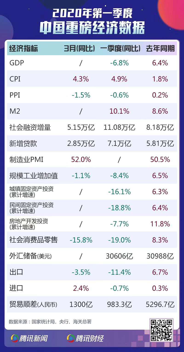 4月17日,國新辦就2020年一季度國民經(jīng)濟運行情況舉行新聞發(fā)布會。國家統(tǒng)計局新聞發(fā)言人毛盛勇介紹,初步核算,一季度國內(nèi)生產(chǎn)總值206504億元,按可比價格計算,同比下降6.8%。