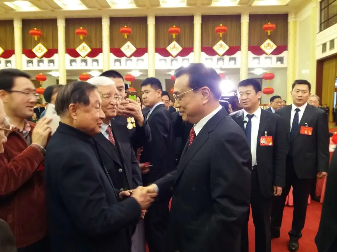 2016年春節(jié)團(tuán)拜會(huì)上,李克強(qiáng)總理與高尚全握手