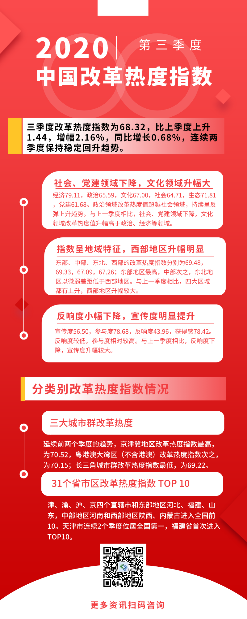 10月20日,中國經(jīng)濟體制改革研究會發(fā)布《2020年第三季度中國改革熱度第三方評估報告》。河南省熱度指數(shù)71.48,在31個?。ㄗ灾螀^(qū)、省轄市)中排在天津、重慶、上海、陜西、北京之后,列第六位。濮陽改革熱度指數(shù)74.95,在全國337個城市中位居第五(在318個副省級以下城市中位居第四),在中部城市中位居第二,在河南省位居第一。前15名分別是:郴州、昆明、河源、天津、濮陽、西安、開封、西寧、楚雄、福州、重慶、鄭州、南昌、洛陽、保定。