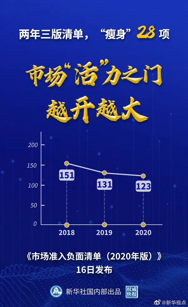 國家發(fā)展改革委、商務部16日公布《市場準入負面清單(2020年版)》。新版清單直接放開“森林資源資產(chǎn)評估項目核準”等措施,刪除“證券公司董事、監(jiān)事、高級管理人員任職資格核準”等措施,清單事項縮減至123項,比2019年版清單再減8項。(記者安蓓 海報設計:張惠慧 張晨光)