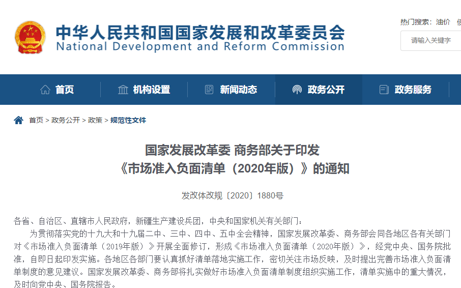 國家發(fā)展改革委新聞發(fā)言人孟瑋表示,從2018年12月正式發(fā)布全國統(tǒng)一的市場準入負面清單以來,通過三年落地實施,已經(jīng)實現(xiàn)了在全國范圍確立了市場準入環(huán)節(jié)的負面清單管理模式。清單之外的行業(yè)、領域、業(yè)務等,市場主體可以依法平等進入,實現(xiàn)“非禁即入”。