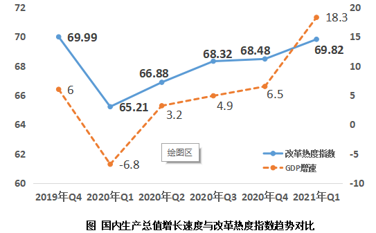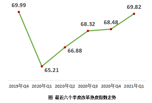 421日,中國經(jīng)濟(jì)體制改革研究會在京發(fā)布《2021年第季度改革熱度第三方評估報告》。報告顯示,2021年第季度改革熱度指數(shù)為69.82,比上一季度增加1.34,連續(xù)4個季度保持穩(wěn)定回升態(tài)勢;比去年同期增加4.61,已經(jīng)基本接近疫情前2019年第4季度69.99的水平。