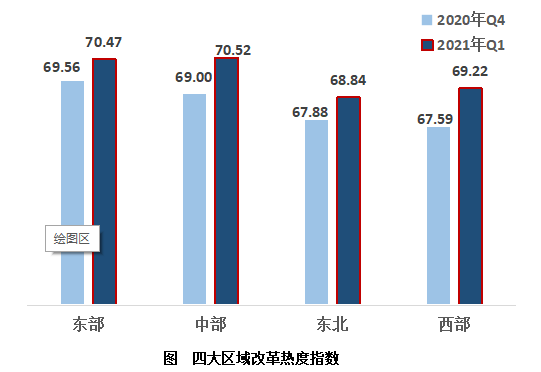 2、中西部地區(qū)引領(lǐng)指數(shù)回升趨勢。從四大區(qū)域來看,東部、中部、東北、西部的改革熱度指數(shù)分別為70.47,70.5268.84,69.22;中、西部地區(qū)指數(shù)增幅超越東部。從排名來看,中部地區(qū)超越東部地區(qū),名列第一;西部地區(qū)小幅超越東北地區(qū)位居第三,東北地區(qū)墊底。