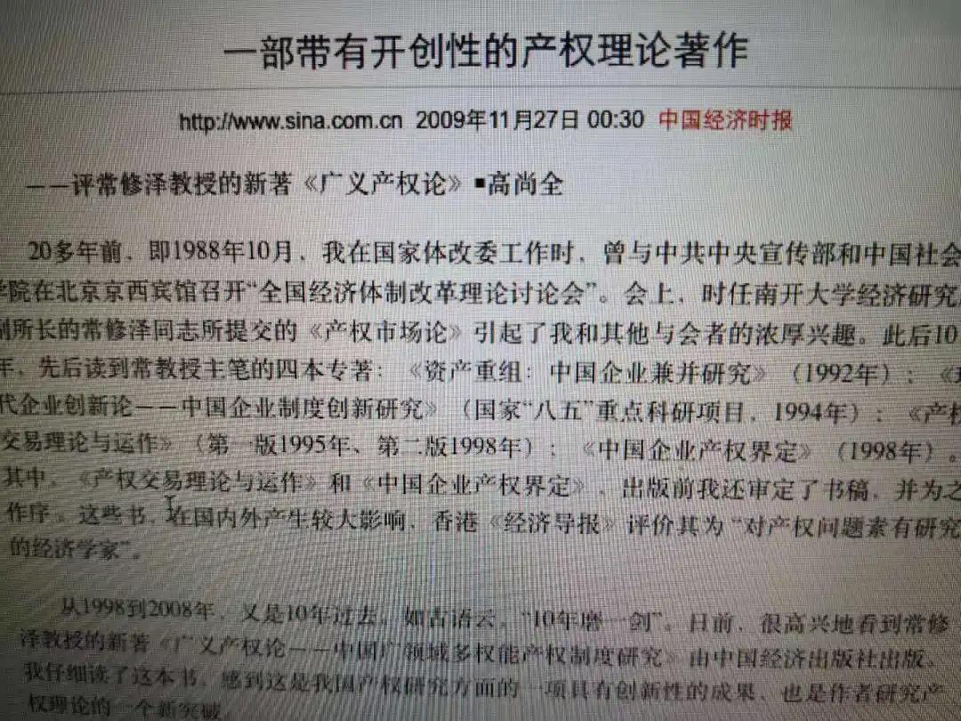 出版后,有肯定,也有非議:如說天地人產(chǎn)權(quán)是“異想天開”,產(chǎn)權(quán)三要義(廣領(lǐng)域、多權(quán)能、四聯(lián)動(dòng))“過于寬泛”等等(這很正常的)。在此之際,您也參與討論,公開發(fā)表文章,支持“從世界和中國大局研究產(chǎn)權(quán)問題”;肯定“廣義產(chǎn)權(quán)理論”,認(rèn)為“對(duì)國家發(fā)展有應(yīng)用價(jià)值”等(見高尚全:《一部帶有開創(chuàng)性的產(chǎn)權(quán)理論著作》,《中國經(jīng)濟(jì)時(shí)報(bào)》2010年11月27日)。今天,再憶這段往事,再讀您的文章,既感謝您2003年的指點(diǎn),也感激您2010年的支持。