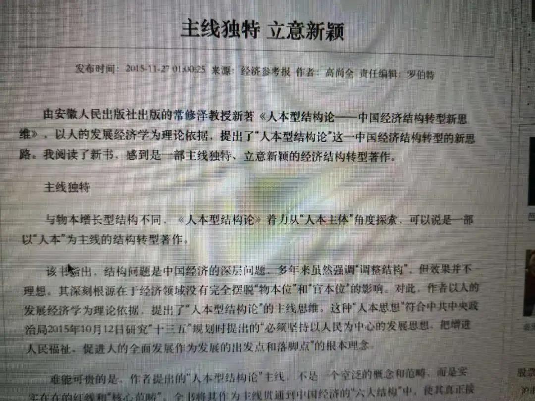七年后,2008年,人本經(jīng)濟(jì)學(xué)研究成果專著之一《人本體制論——中國人的發(fā)展及體制安排研究》出版。又過七年,2015年,人本經(jīng)濟(jì)學(xué)研究成果專著之二《人本型結(jié)構(gòu)論——中國經(jīng)濟(jì)結(jié)構(gòu)轉(zhuǎn)型新思維》也出版問世。在書中,按照我的人本經(jīng)濟(jì)學(xué)理念,特別挖掘了馬克思在《政治經(jīng)濟(jì)學(xué)批判導(dǎo)言》中關(guān)于“人”是主人、“品”是“仆役”的思想,試圖與傳統(tǒng)的“物本經(jīng)濟(jì)學(xué)”和“權(quán)本經(jīng)濟(jì)學(xué)”“ 劃清界限。我沒有忘記:出版后,您在《經(jīng)濟(jì)參考報(bào)》撰文給予支持,題目雖然只有八個(gè)字:“主線獨(dú)特.立意新穎”,但觀點(diǎn)鮮明,呵護(hù)有加,頗感溫暖(見高尚全:《主線獨(dú)特.立意新穎》,《經(jīng)濟(jì)參考報(bào)》2015年12月1日)。