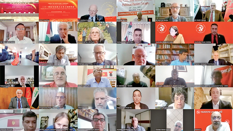 2022年7月28日,中國共產(chǎn)黨與世界馬克思主義政黨論壇舉行。習近平總書記在賀信中強調,中國共產(chǎn)黨愿同各國馬克思主義政黨加強交流對話,立足本國國情,把準時代脈搏,不斷豐富和發(fā)展馬克思主義,在攜手推動構建人類命運共同體的進程中讓馬克思主義展現(xiàn)出更強大的真理力量。圖為外國政黨代表線上參加論壇。 中共中央對外聯(lián)絡部供圖