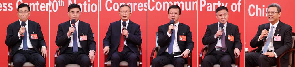 10月20日,中國(guó)共產(chǎn)黨第二十次全國(guó)代表大會(huì)新聞中心舉行集體采訪。青海、寧夏、新疆、中央和國(guó)家機(jī)關(guān)、中央金融系統(tǒng)、中央企業(yè)系統(tǒng)(在京)代表團(tuán)新聞發(fā)言人出席,介紹代表團(tuán)學(xué)習(xí)討論二十大報(bào)告情況,并回答記者提問(wèn)(拼版照片)。新華社記者 張玉薇 攝