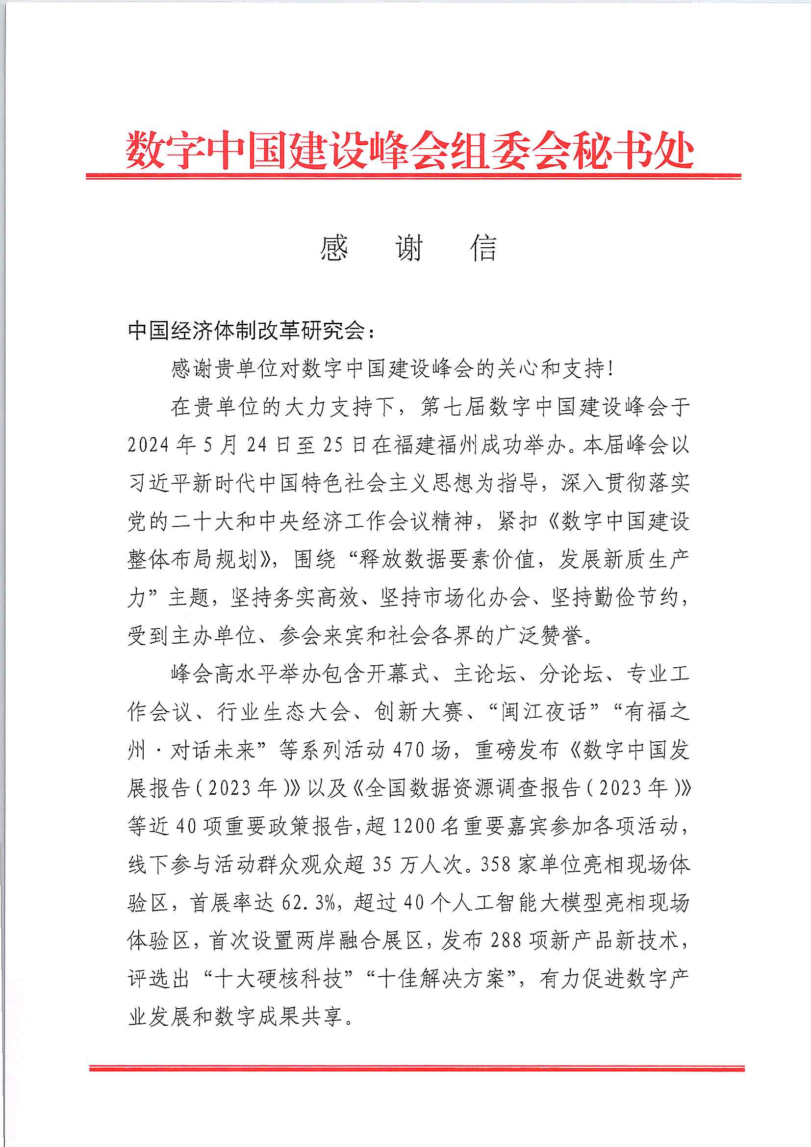 日前,我會收到來自數(shù)字中國建設峰會組委會的感謝信。信中就我會對第七屆數(shù)字中國建設峰會成功舉辦的支持表示感謝。未來我會將繼續(xù)積極組織參與峰會活動,為加快數(shù)字中國建設和推進中國式現(xiàn)代化作出更大貢獻。