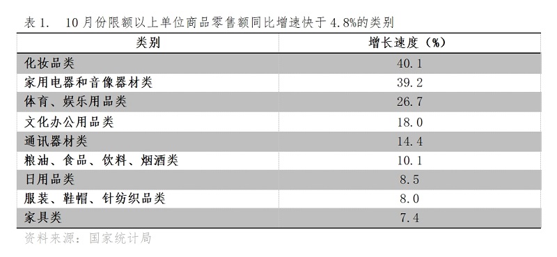 10月份,限額以上單位商品零售額增速快于社會消費品零售總額4.8%增速的共有9類,即化妝品類同比增長40.1%,家用電器和音像器材類增長39.2%,體育、娛樂用品類增長26.7%,文化辦公用品類增長18.0%,通訊器材類增長14.4%,糧油、食品、飲料、煙酒類增長10.1%,日用品類增長8.5%,服裝、鞋帽、針紡織品類增長8.0%,家具類增長7.4%。