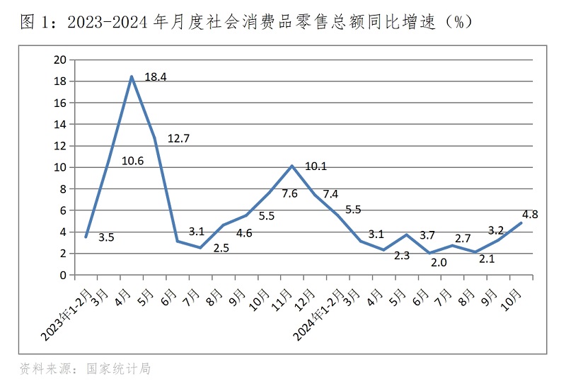 (一)零售增速繼續(xù)回升。10月份,社會消費品零售總額同比增長4.8%,比9月份增長3.2%回升了1.6個百分點,9月份比8月份增長2.1%回升了1.1個百分點。社會消費品零售總額增速的持續(xù)回升,既反映了政策措施取得了積極效果,也說明消費者對有效政策措施的響應較為積極。隨著消費品以舊換新政策措施力度的不斷加大,家用電器和音像器材以及汽車零售額增長加快或由負轉正,10月份限額以上企業(yè)家用電器和音像器材零售額增長39.2%,比9月份加快17.7個百分點,9月份比8月份加快17.1個百分點;汽車零售額增長3.7%,比9月份加快3.3個百分點,9月份為增長0.4%,8月份為下降7.3%。可見,實施有效的政策措施對擴大消費的效果是明顯的積極的。