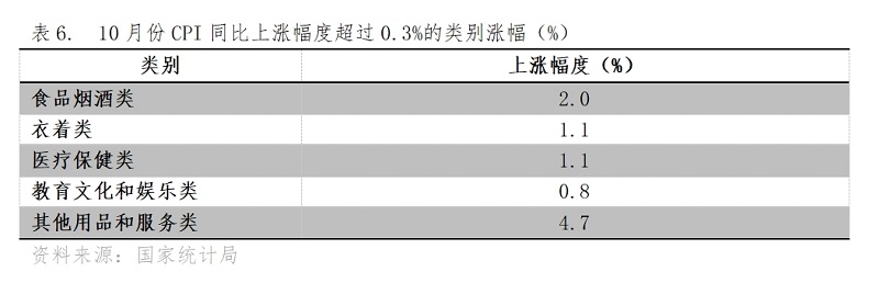 漲幅超過CPI同比上漲0.3%的類別共有5類,即食品煙酒類價格同比上漲2.0%,衣著類上漲1.1%,醫(yī)療保健類上漲1.1%,教育文化和娛樂類上漲0.8%,其他用品和服務類上漲4.7%。