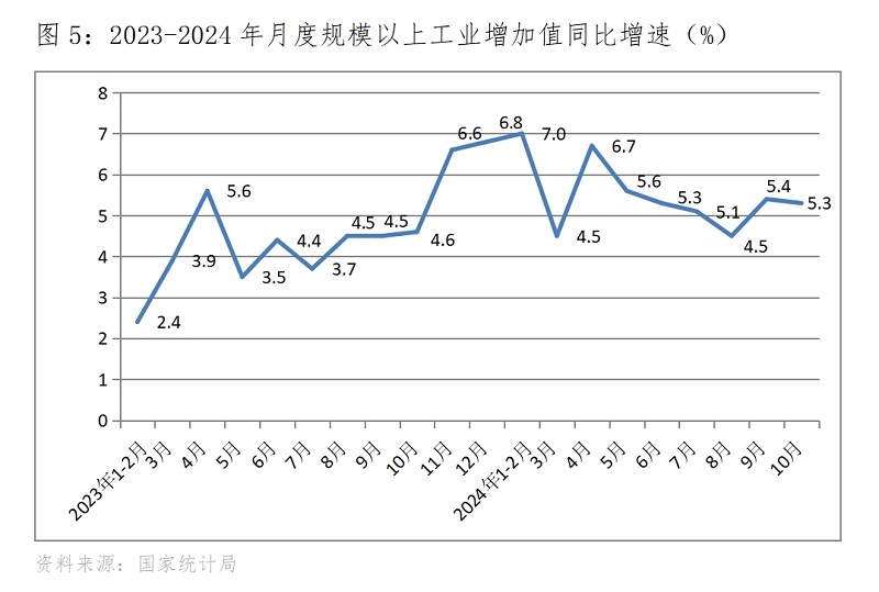 (一)工業(yè)增速由升轉落。10月份,規(guī)模以上工業(yè)增加值同比增長5.3%,比9月份增長5.4%回落了0.1個百分點,9月份比8月份回升了0.9個百分點。10月份工業(yè)增速回落,雖然幅度不大,但這是在9月份回升后的回落,也是在上年同期基數并不高的基礎上的回落,而且還是在政策措施力度不斷加大下的回落,充分說明工業(yè)回升仍面臨著較大的壓力。