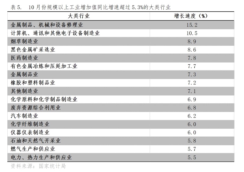 10月份,增長速度超過規(guī)模以上工業(yè)增長5.3%的主要大類行業(yè)共有17個,即金屬制品、機械和設備修理業(yè)同比增長15.2%,計算機、通訊和其他電子設備制造業(yè)增長10.5%,煙草制造業(yè)增長8.9%,黑色金屬礦采選業(yè)增長8.6%,醫(yī)藥制造業(yè)增長7.8%,有色金屬冶煉和壓延加工業(yè)增長7.7%,金屬制品業(yè)增長7.3%,橡膠和塑料制品業(yè)增長7.2%,其他制造業(yè)增長7.1%,化學原料和化學制品制造業(yè)增長6.9%,廢棄資源綜合利用業(yè)增長6.8%,汽車制造業(yè)增長6.2%,化學纖維制造業(yè)增長6.0%,儀器儀表制造業(yè)增長6.0%,石油和天然氣開采業(yè)增長5.8%,燃氣生產和供應業(yè)增長5.7%,電力、熱力生產和供應業(yè)增長5.5%。