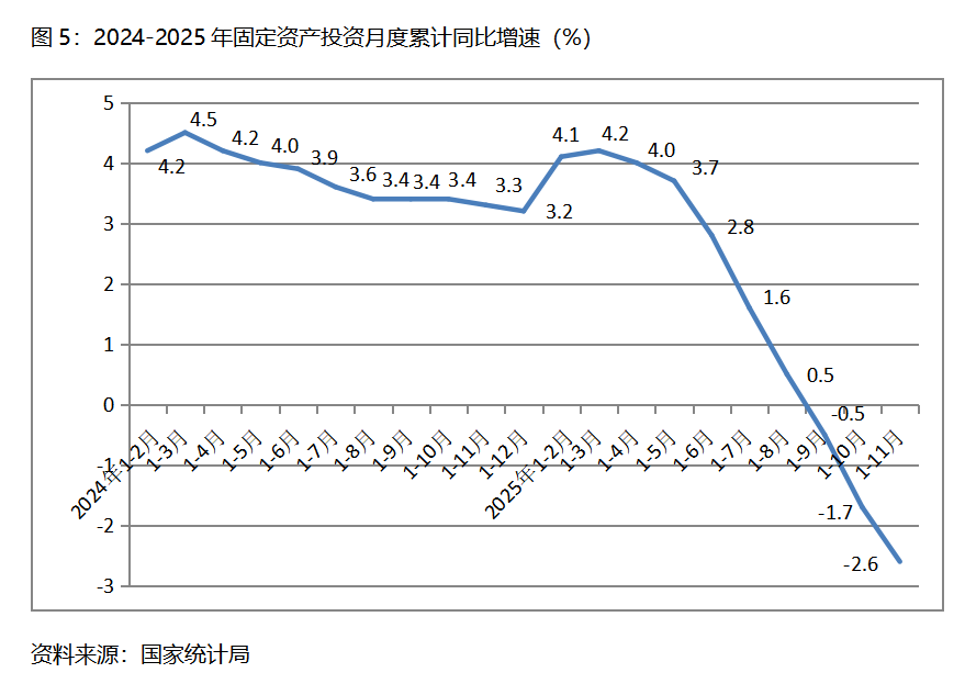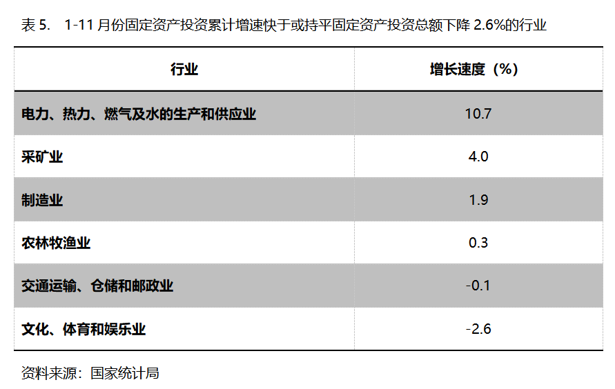 1-11月份,固定資產(chǎn)投資累計(jì)增速快于或持平固定資產(chǎn)投資總額下降2.6%的行業(yè)共6個(gè),即電力、熱力、燃?xì)饧八纳a(chǎn)和供應(yīng)業(yè)增長10.7%,采礦業(yè)增長4.0%,制造業(yè)增長1.9%。農(nóng)林牧漁業(yè)增長0.3%,交通運(yùn)輸、倉儲(chǔ)和郵政業(yè)下降0.1%,文化、體育和娛樂業(yè)下降2.6%。