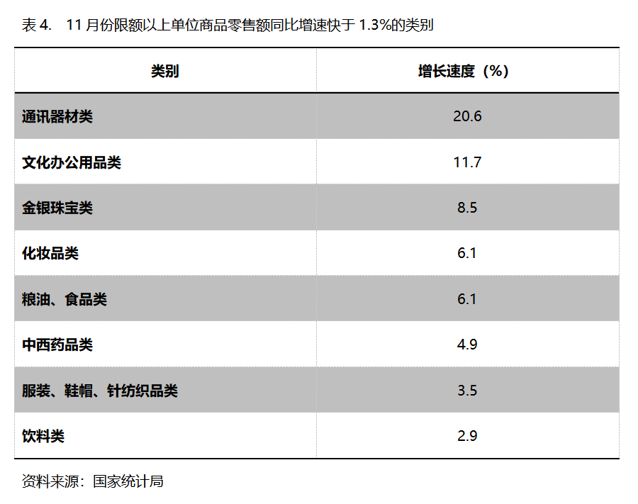 11月份,限額以上單位商品零售額同比增速快于社會(huì)消費(fèi)品零售總額1.3%增速的共有8類,即通訊器材類增長20.6%,文化辦公用品類增長11.7%,金銀珠寶類增長8.5%,化妝品類增長6.1%,糧油、食品類增長6.1%,中西藥品類增長4.9%,服裝、鞋帽、針紡織品類增長3.5%,飲料類增長2.9%。