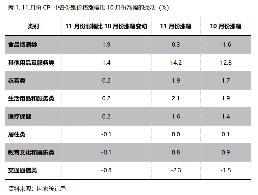 11月份,在CPI 8個(gè)類別中有5個(gè)類別同比漲幅回升,3個(gè)類別回落。漲幅回升的5個(gè)類別包括食品類價(jià)格由降轉(zhuǎn)漲、漲幅回升1.9個(gè)百分點(diǎn),其他用品和服務(wù)類漲幅回升1.4個(gè)百分點(diǎn),衣著類、生活用品及服務(wù)類和醫(yī)療保健類漲幅均回升0.2個(gè)百分點(diǎn);居住類、教育文化和娛樂類漲幅均回落0.1個(gè)百分點(diǎn),交通通訊類降幅擴(kuò)大0.8個(gè)百分點(diǎn)。