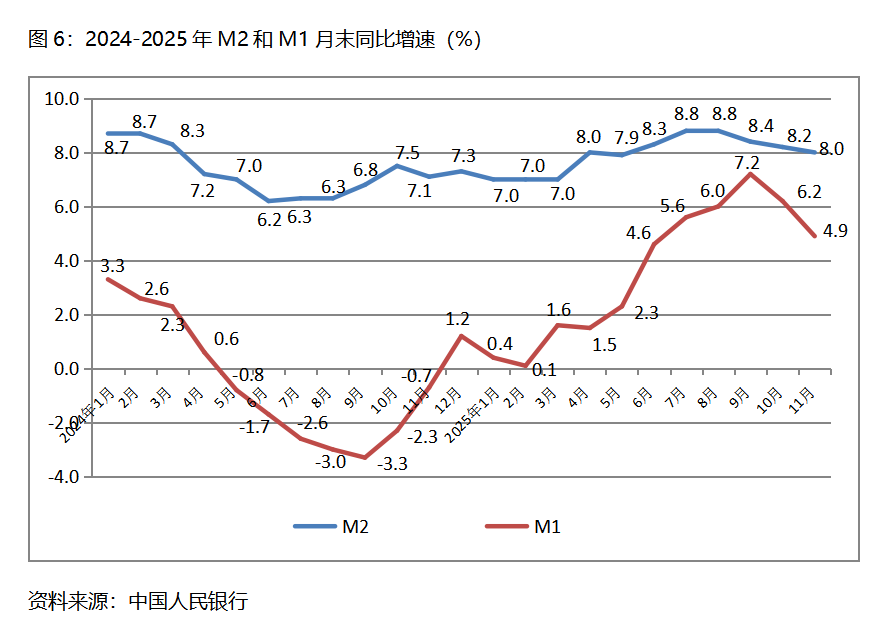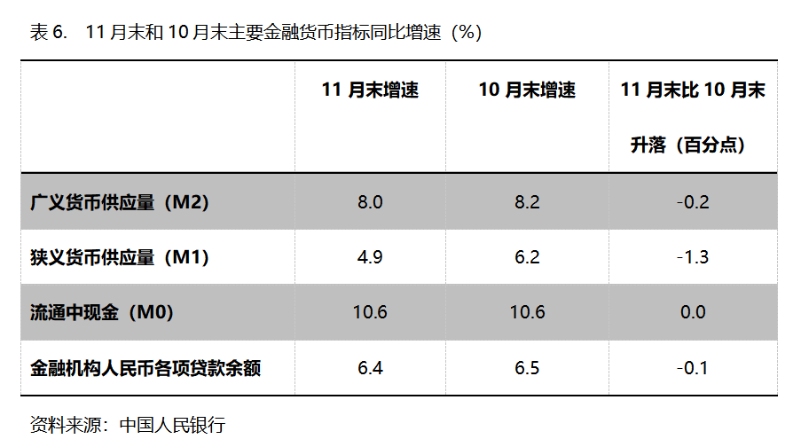六、M2增速持續(xù)回落。11月末,廣義貨幣供應(yīng)量(M2)同比增長8.0%,比10月末增長8.2%回落0.2個(gè)百分點(diǎn),10月末增幅比9月末增長8.4%回落0.2個(gè)百分點(diǎn);狹義貨幣供應(yīng)量(M1)同比增長4.9%,比10月末增長6.2%回落1.3個(gè)百分點(diǎn),10月末增幅比9月末增長7.2%回落1.0個(gè)百分點(diǎn);流通中貨幣(M0)同比增長10.6%,與10月末增長10.6%持平,10月末增幅比9月末增長11.5%回落0.9個(gè)百分點(diǎn)。11月份末,M2增速已連續(xù)3個(gè)月回落,M1增速已連續(xù)2個(gè)月回落,M0由回落轉(zhuǎn)為持平。