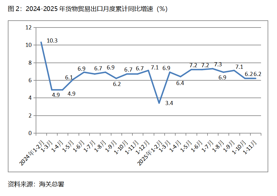 二、出口增速由落轉(zhuǎn)平。1-11月份,貨物出口同比增長6.2%,與1-10月份增長6.2%持平,1-10月份比1-9月份增長7.1%回落0.9個(gè)百分點(diǎn)。貨物出口對(duì)主要貿(mào)易出口經(jīng)濟(jì)體增速有升有落有平,1-11月份對(duì)歐盟出口同比增長8.9%,比1-10月份對(duì)歐盟出口同比增長8.4%回升0.5個(gè)百分點(diǎn);對(duì)美國出口下降18.3%,比1-10月份下降17.1%擴(kuò)大1.2個(gè)百分點(diǎn);對(duì)東盟出口增長14.6%,比1-10月份增長15.3%回落0.7個(gè)百分點(diǎn);對(duì)拉丁美洲出口增長7.9%,比1-10月份增長7.3%回升0.6個(gè)百分點(diǎn);對(duì)非洲出口增長27.2%,與1-10月份增長27.2%持平。貨物出口在跌宕起伏的國際形勢(shì)下仍保持穩(wěn)定增長,彰顯出我國對(duì)外貿(mào)易的較強(qiáng)韌性。