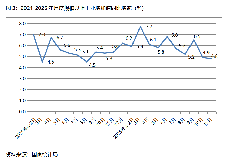 三、工業(yè)增速持續(xù)回落。11月份,規(guī)模以上工業(yè)增加值同比增長4.8%,比10月份增長4.9%回落了0.1個(gè)百分點(diǎn),10月份比9月份增長6.5%回落了1.6個(gè)百分點(diǎn)。從工業(yè)三大門類看,采礦業(yè)增速比上月回升,制造業(yè)和電力、熱力、燃?xì)饧八a(chǎn)和供應(yīng)業(yè)增速回落,11月份,采礦業(yè)同比增長6.3%,比上月增長4.5%回升1.8個(gè)百分點(diǎn);制造業(yè)增長4.6%,比上月增長4.9%回落0.3個(gè)百分點(diǎn);電力、熱力、燃?xì)饧八a(chǎn)和供應(yīng)業(yè)增長4.3%,比上月增長5.4回落1.1個(gè)百分點(diǎn)。