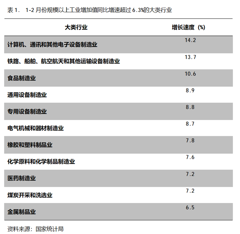1-2月份,增長速度超過或持平規(guī)模以上工業(yè)增長6.3%的主要大類行業(yè)共有11個,即計算機、通訊和其他電子設(shè)備制造業(yè)增長14.2%,鐵路、船舶、航空航天和其他運輸設(shè)備制造業(yè)增長13.7%,食品制造業(yè)增長10.6%,通用設(shè)備制造業(yè)增長8.9%,專用設(shè)備制造業(yè)增長8.8%,電氣機械和器材制造業(yè)增長8.7%,橡膠和塑料制品業(yè)增長7.8%,化學(xué)原料和化學(xué)制品制造業(yè)增長7.6%,醫(yī)藥制造業(yè)增長7.2%,煤炭開采和洗選業(yè)增長7.2%,金屬制品業(yè)增長6.5%。