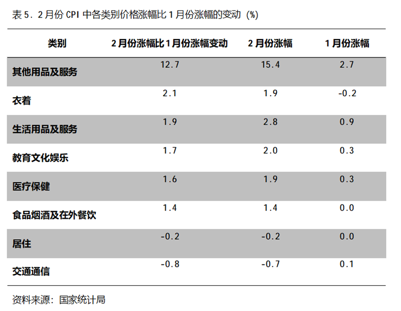 2月份,在CPI 8個類別中有6個類別同比漲幅回升,2個類別回落。漲幅回升的5個類別包括其他用品及服務(wù)漲幅回升12.7個百分點,衣著由降轉(zhuǎn)漲、漲幅回升2.1個百分點,生活用品及服務(wù)漲幅回升1.9個百分點,教育文化娛樂漲幅回升1.7個百分點,醫(yī)療保健漲幅回升1.6個百分點,食品煙酒及在外餐飲價格由平轉(zhuǎn)漲、漲幅回升1.4個百分點,居住由平轉(zhuǎn)降、降幅擴大0.2個百分點,交通通信由漲轉(zhuǎn)降、降幅擴大0.8個百分點。