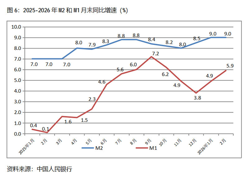 六、M2增速由升轉(zhuǎn)平。2月末,廣義貨幣供應(yīng)量(M2)同比增長9.0%,與1月份末增長9.0%持平,1月末增幅比上年末增長8.5%回升0.5個百分點;狹義貨幣供應(yīng)量(M1)同比增長5.9%,比1月末增長4.9%回升1.0個百分點,1月末增幅比上年末增長3.8%回升1.1個百分點;流通中貨幣(M0)同比增長14.1%,比1月末增長2.7%回升11.4個百分點,1月末增幅比上年末增長10.2%回落7.5個百分點。2月末,雖然M2增速與M1增速差距進一步縮小,但仍還保持著不小的差距。