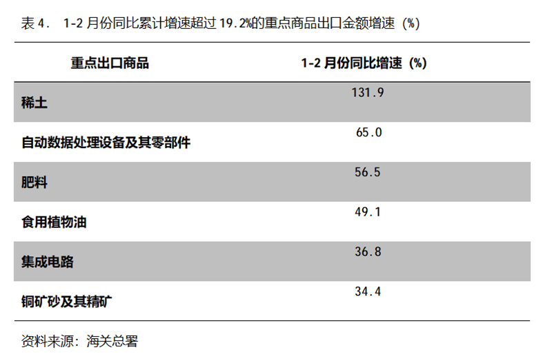 1-2月份,出口金額同比增速超過19.2%的重點商品共有6類,即稀土出口同比增長131.9%,自動數(shù)據(jù)處理設(shè)備及其零部件增長65.0%,肥料出口增長56.5%,食用植物油增長49.1%,集成電路增長36.8%,銅礦砂及其精礦增長34.4%。