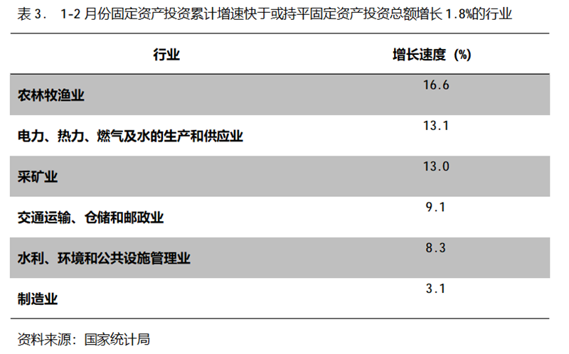 1-2月份,固定資產(chǎn)投資累計增速快于或持平固定資產(chǎn)投資總額增長1.8%的行業(yè)共6個,即農(nóng)林牧漁業(yè)增長16.6%,電力、熱力、燃氣及水的生產(chǎn)和供應(yīng)業(yè)增長13.1%,采礦業(yè)增長13.0%,交通運輸、倉儲和郵政業(yè)增長9.1%,水利、環(huán)境和公共設(shè)施管理業(yè)增長8.3%,制造業(yè)增長3.1%。